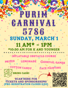 Join us at our annualĀ ruach-filledĀ Purim Carnival! It is sure to be fun for the whole family!