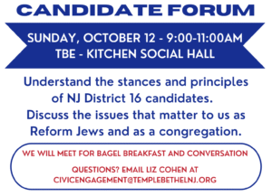 To help our congregants prepare to vote in the upcoming November election, Temple Beth-El will be hosting a nonpartisan Candidate Forum with the candidates for the New Jersey State Assembly for the 16th Legislative District (covering parts of Somerset, Mercer, Middlesex, and Hunterdon counties, including Hillsborough).